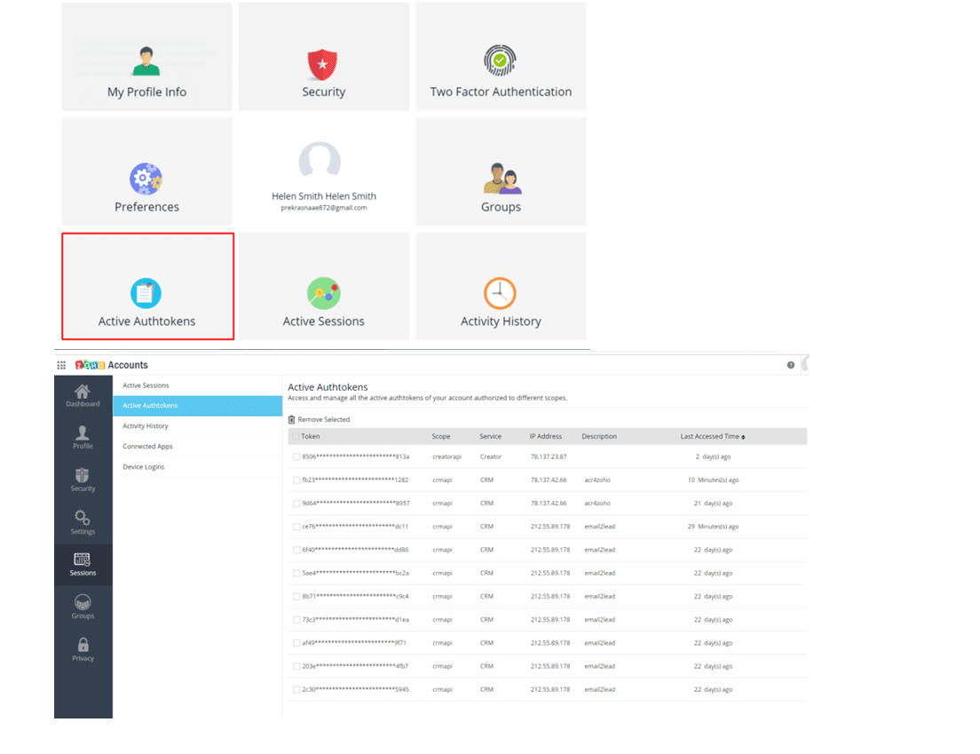 So erhalten Sie Zugriff auf die Tokens und Schlüssel Ihres Kontos: Melden Sie sich bei Ihrem Zoho-Konto an – https://accounts.zoho.com ->ActiveAuthtokens.