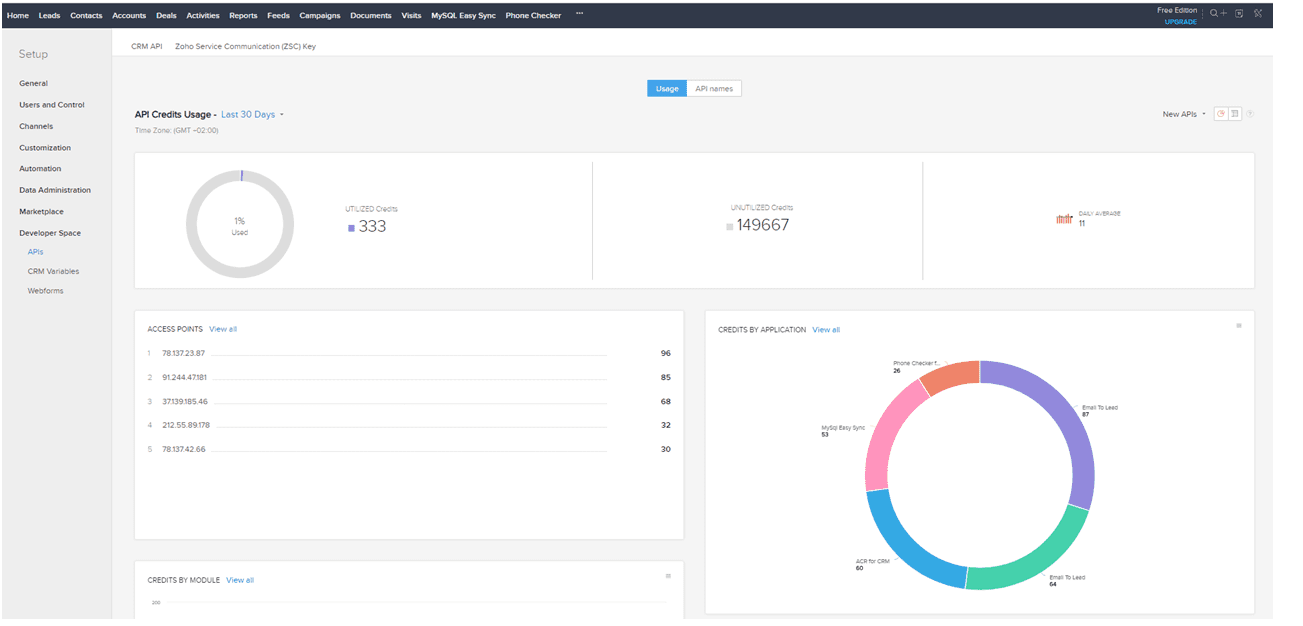 So können Sie die Statistiken einsehen: CRM in Zoho CRM zu „Einstellungen“ – „Entwicklerbereich“ – API Setup > Developer Space APIs). Die Statistiken können für die letzten 24 Stunden, die letzten 7 Tage, die letzten 30 Tage oder für einen beliebigen Zeitraum abgerufen werden.
