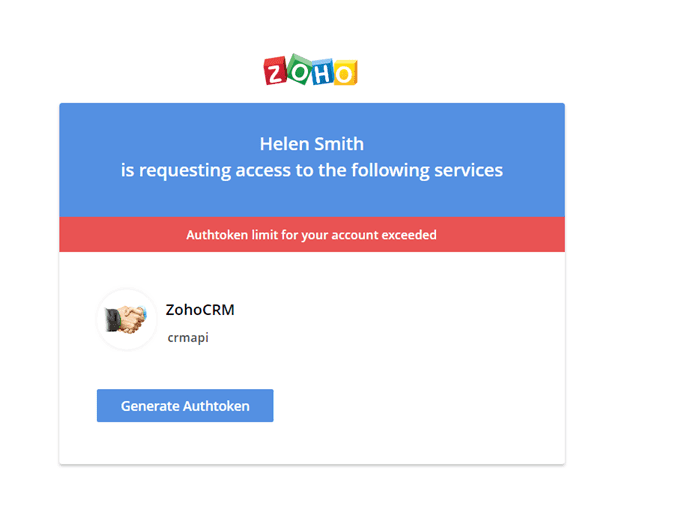 Für jedes Zoho-Konto gilt ein Limit für die Generierung von Tokens. Wenn Ihr Limit erreicht ist, löschen Sie eines der zuvor generierten Tokens (https://accounts.zoho.com ->ActiveAuthtokens) und generieren Sie ein neues Token.
