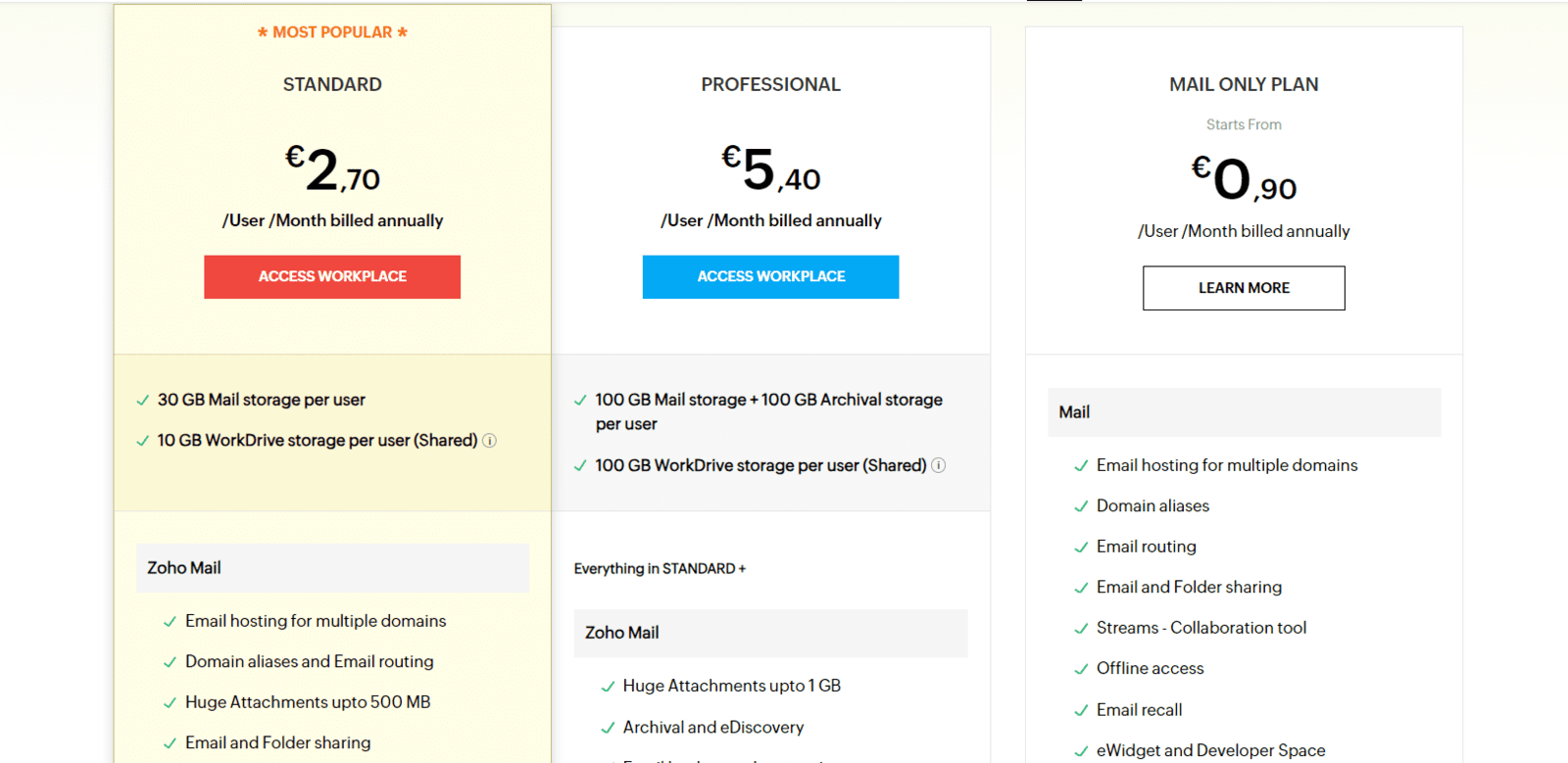 9. Skalierbare Preispläne: Zoho Mail eine Reihe von Preisplänen Zoho Mail , darunter einen kostenlosen Tarif für kleine Unternehmen und Start-ups. Wenn Ihr Unternehmen wächst, können Sie Premium-Tarife in Betracht ziehen, die zusätzlichen Speicherplatz, erweiterte Funktionen und Anpassungsmöglichkeiten bieten.