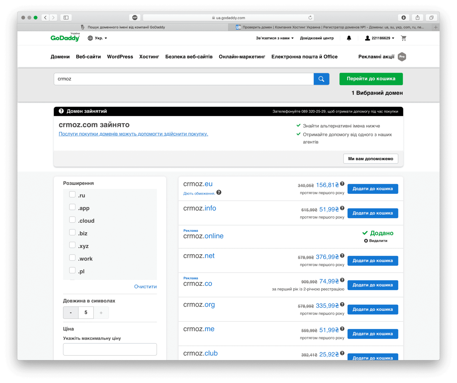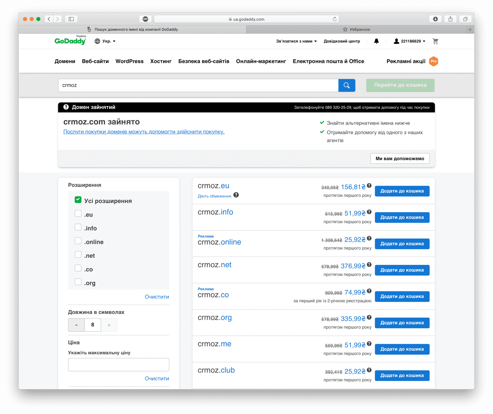 Anschließend sollten Sie den gewünschten Domainnamen in verschiedenen Zonen suchen, beispielsweise in beliebten Endungen wie .com, .ua, .net oder in neueren, trendigen Endungen wie .studio, .web und .art