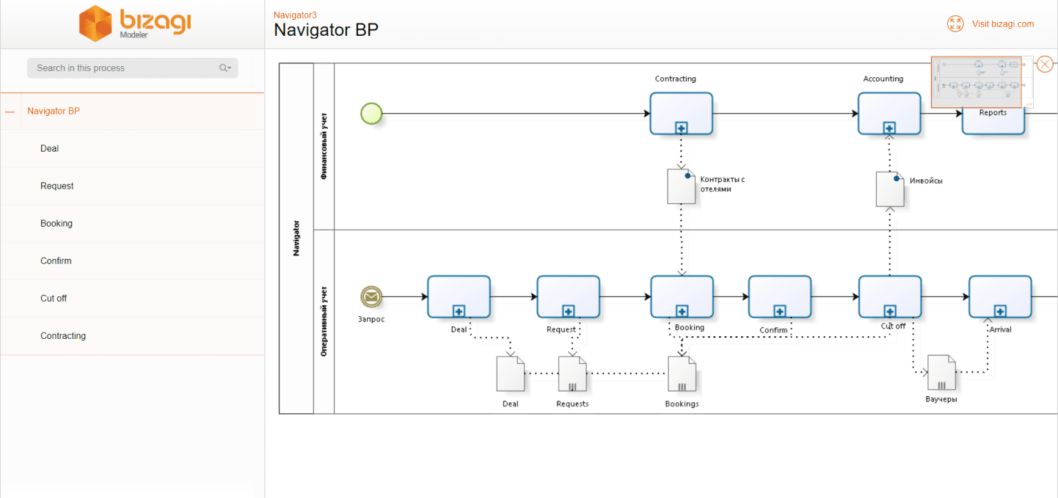 Eine russische Entwicklung. Es gibt eine kostenlose Version. Das System zur Verwaltung von Geschäftsprozessen basiert auf einer einfachen Idee: Sie erstellen ein Modell der Geschäftsprozesse Ihres Unternehmens mithilfe anschaulicher Diagramme ( BPMN), laden diese Beschreibungen in das Computersystem ELMA hoch, und das Programm ermöglicht es Ihnen, die Ausführung der Prozesse in der tatsächlichen Arbeitspraxis des Unternehmens zu verfolgen.