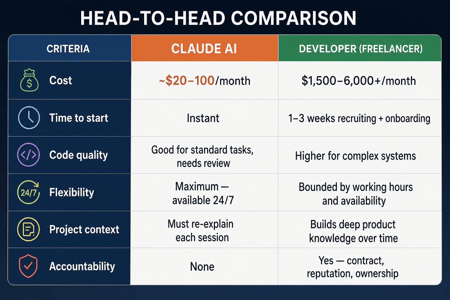 Zu Beginn kann Claude Ihr erster „Entwickler“ sein. Doch wenn das Produkt wächst, wird ein echter Entwickler zur Notwendigkeit und nicht mehr nur ein Luxus. Und wenn Sie bereits einen Entwickler im Team haben – geben Sie ihm Claude. Er wird dadurch mühelos zwei- bis dreimal so produktiv werden. DieFrage ist nicht, wer besser ist. Es geht darum, wo Sie gerade stehen – und welches Problem Sie heute tatsächlich lösen müssen.