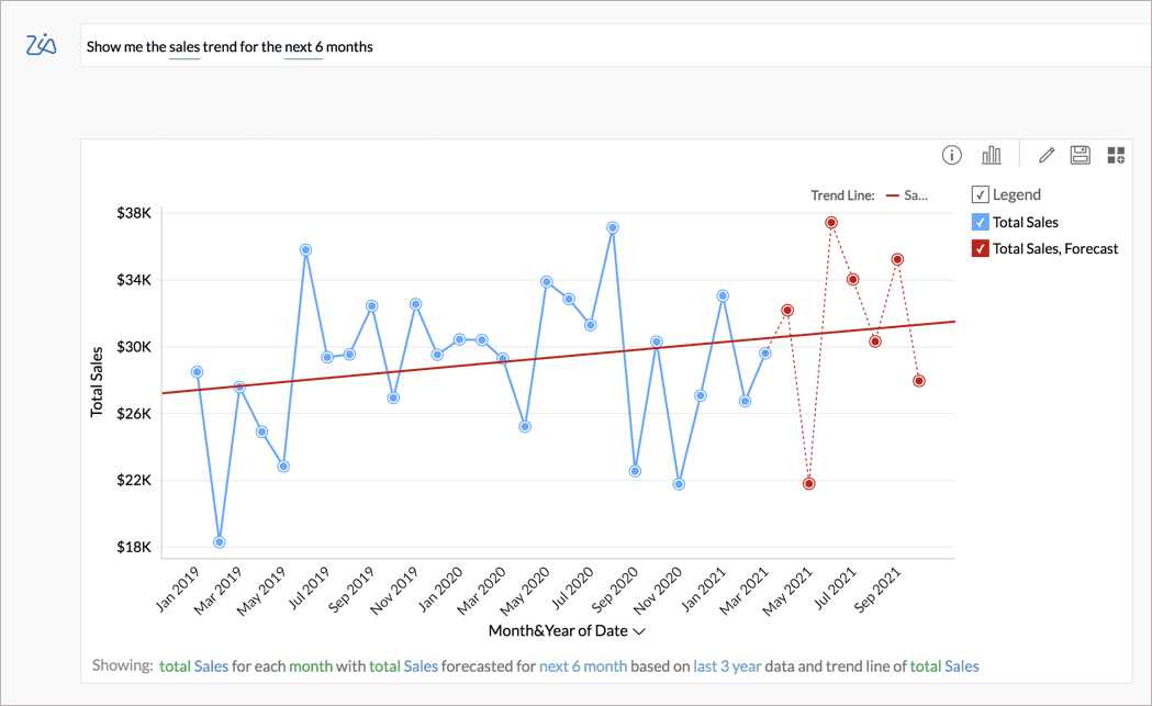 Ask Zia prädiktive Analysen. Sie können Zia nun Zia zu zukünftigen Trends und Prognosen stellen und nicht mehr nur zu historischen Daten.