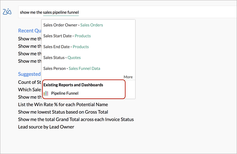 Zia bietet nun Zia bereits vorhandene Berichte und Dashboards an, die für Ihre Anfrage relevant sind.