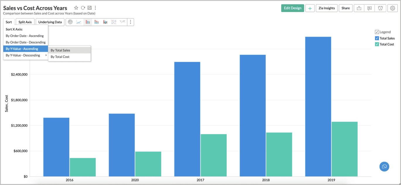 Bisher konnten Sie Multi-Y-Diagramme nur nach der Spalte mit den Messwerten (X-Achse) sortieren. Jetzt Zoho Analytics das Sortieren von Multi-Y-Diagrammen anhand der Werte der Y-Achse. Sie können das Diagramm nach einem der Werte der Y-Achse sortieren.