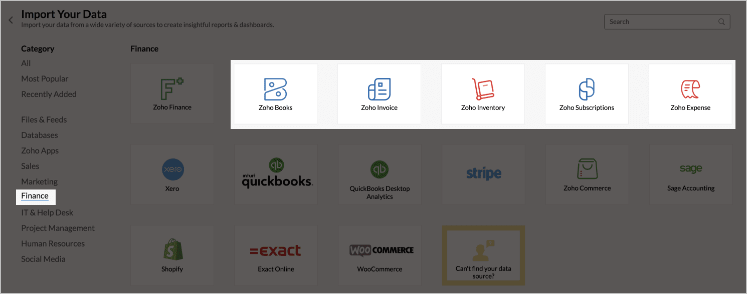 Sie können nun die Integration mit jeder der Zoho Finance-Anwendungen – Zoho Books, Zoho Invoice, Zoho Subscriptions, Zoho Inventory und Zoho Expense individuell über Zoho Analytics einrichten. Alle diese Konnektoren sind als separate Kacheln verfügbar, um die Einrichtung zu vereinfachen.