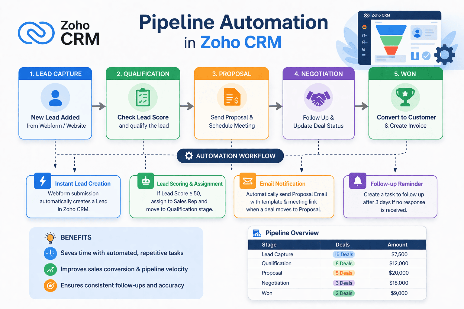 Mit Zoho CRM können Sie die Pipeline-Automatisierung mithilfe verschiedener integrierter Tools einrichten – ganz ohne Programmierkenntnisse :