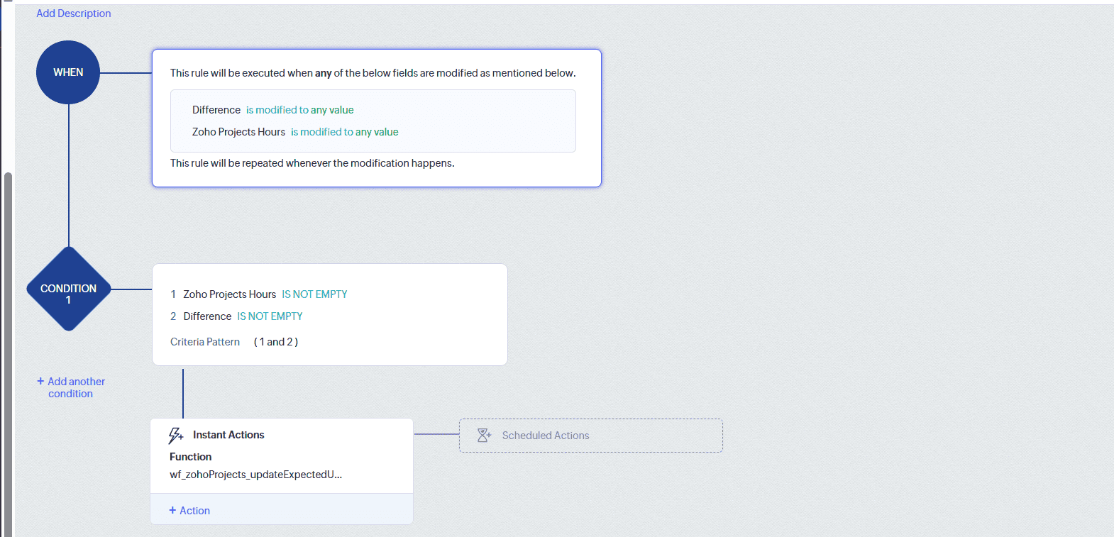 Beispiel: Sobald ein Geschäft in den Status „Angebot gesendet“ wechselt, führt Zoho CRM folgende Schritte aus: