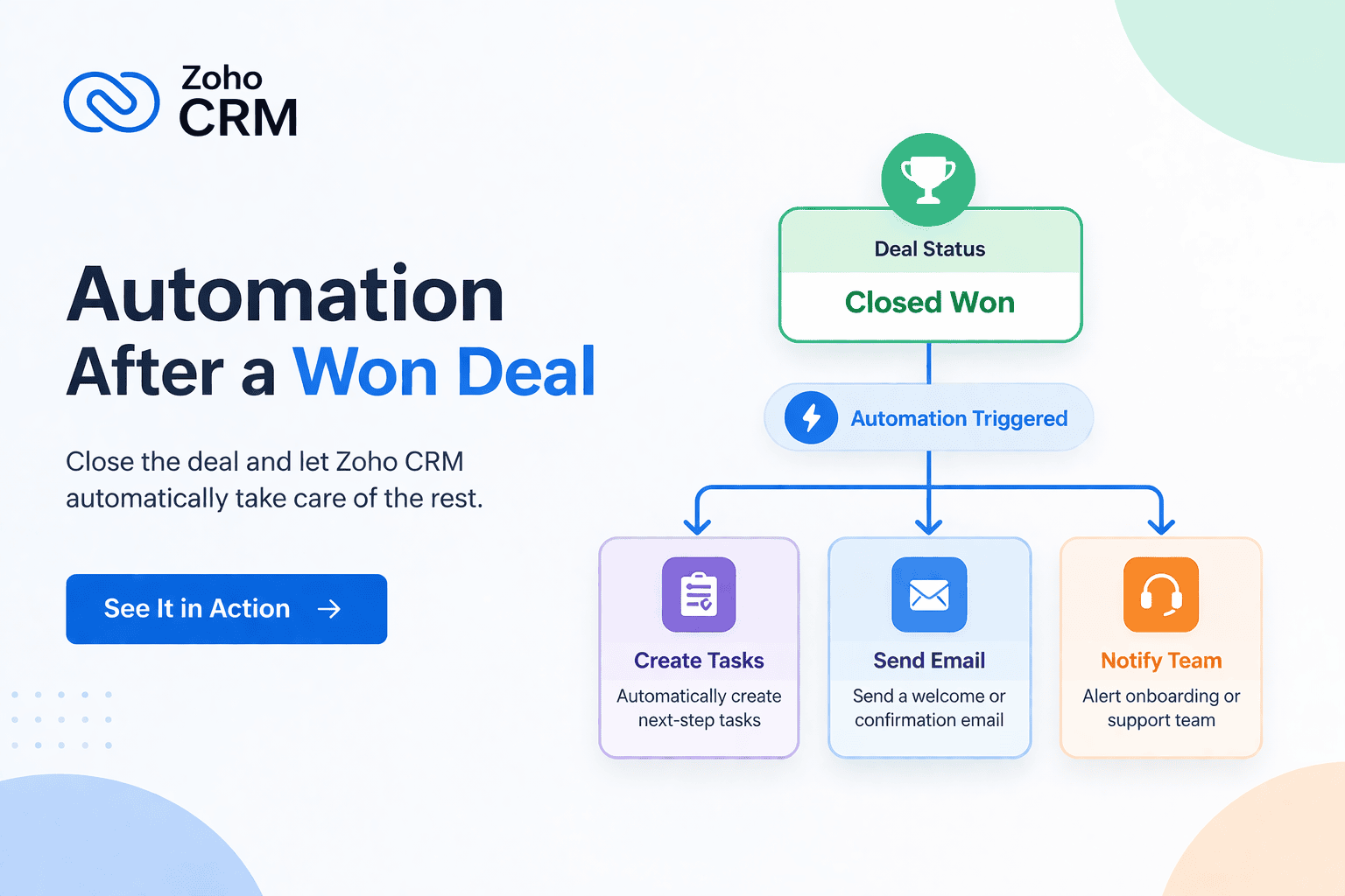 Ein Klick – mehrere Aktionen auf einmal. Der Manager klickt auf „Angebot senden“ und ZohoCRM versendet automatisch eine E-Mail-Vorlage, aktualisiert den Status des Geschäfts, erstellt eine Folgeaufgabe und protokolliert die Aktivität. Fünf manuelle Schritte werden durch einen einzigen ersetzt.