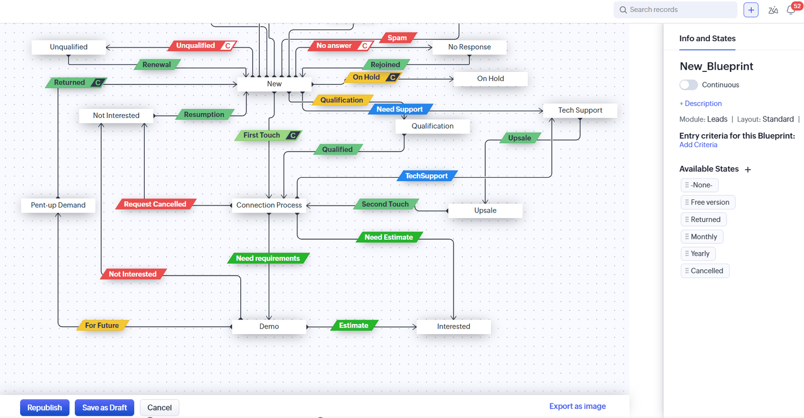 Blueprint ist ein leistungsfähigeres Tool. Damit können Sie für jede Phase der Pipeline ein genaues Szenario festlegen: Was muss der Manager tun, bevor ein Geschäft weiterbearbeitet wird, welche Felder sind Pflichtfelder und wer muss den Übergang genehmigen?