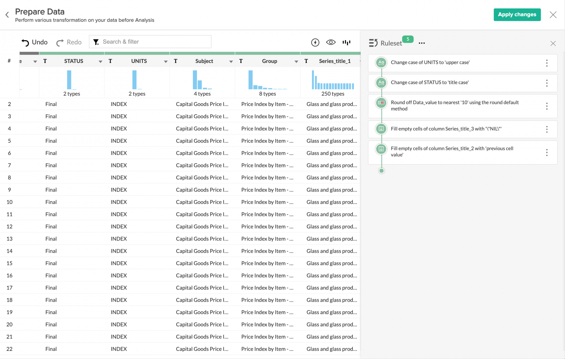 Mithilfe von Regelsätzen können Sie jede an den Daten vorgenommene Änderung nachverfolgen. Außerdem ist es möglich, Änderungen jederzeit zu ändern, zu deaktivieren oder zu löschen. Sie können Regelsätze wiederverwenden, um denselben Satz von Änderungen auf andere Datensätze anzuwenden, indem Sie die automatische Datenaufbereitung deaktivieren.