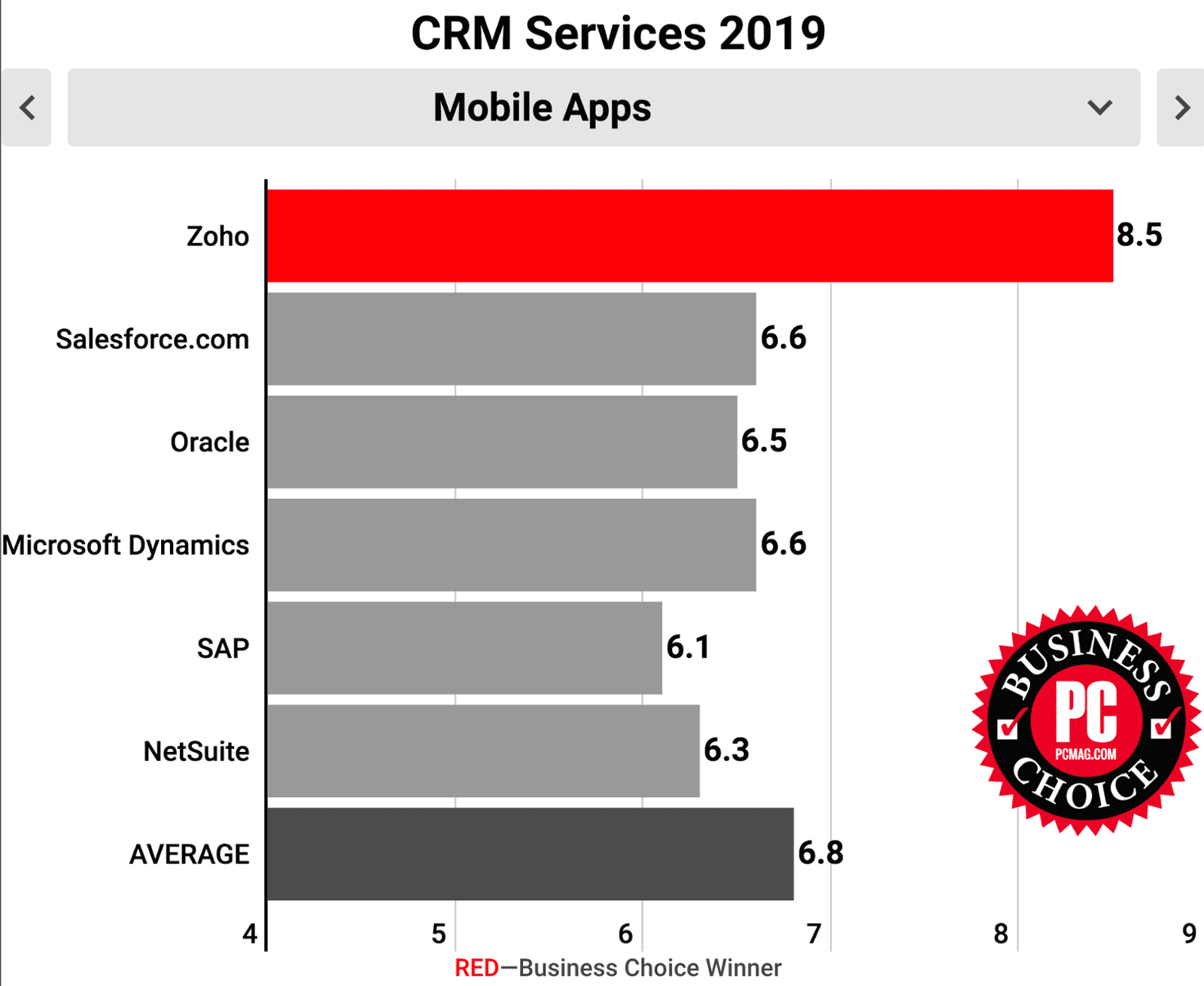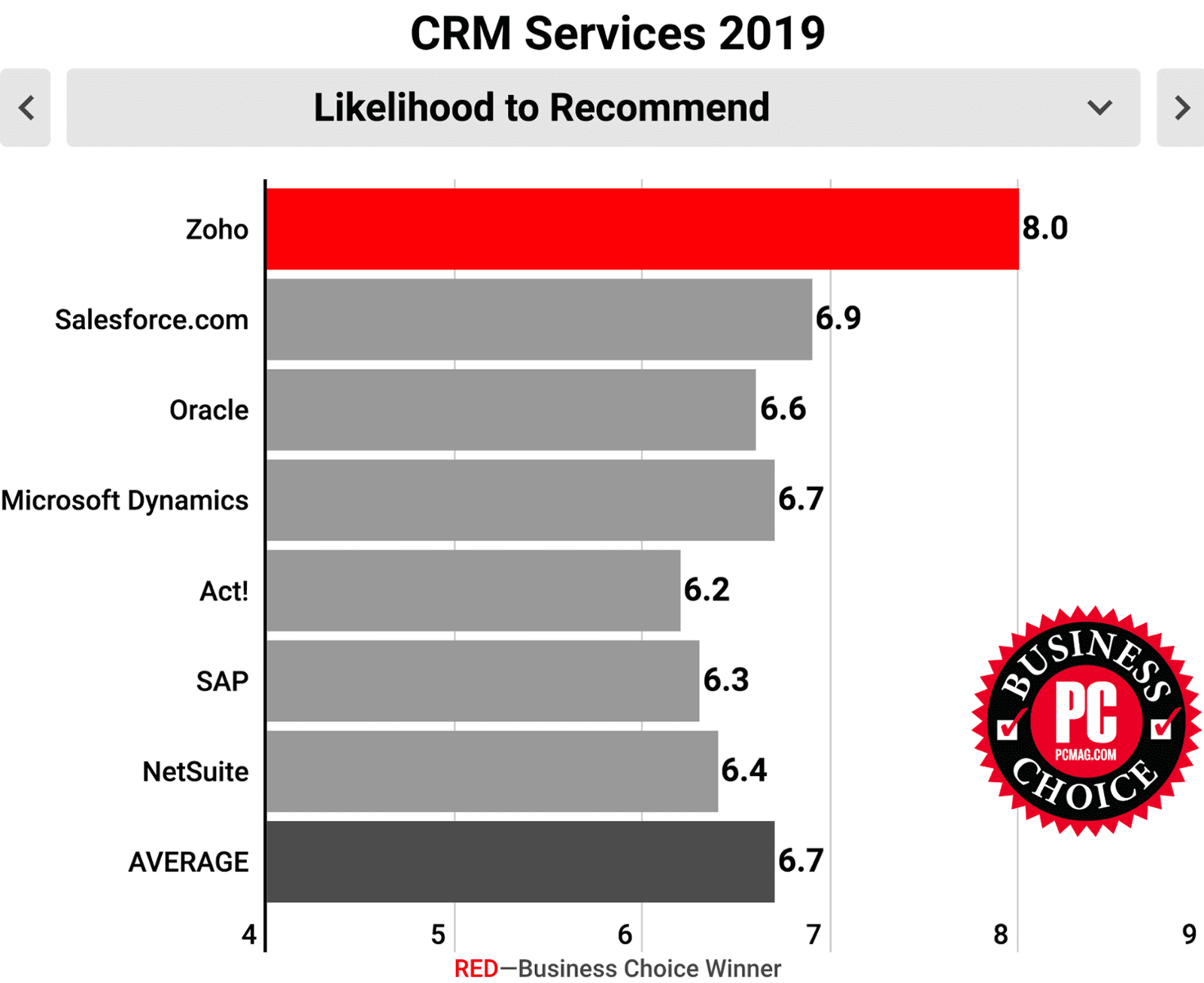 - Zoho wurde CRM PCMag mit 8,0 Punkten als das am häufigsten empfohlene CRM genannt und lag damit deutlich vor Salesforce anderen führenden CRM.